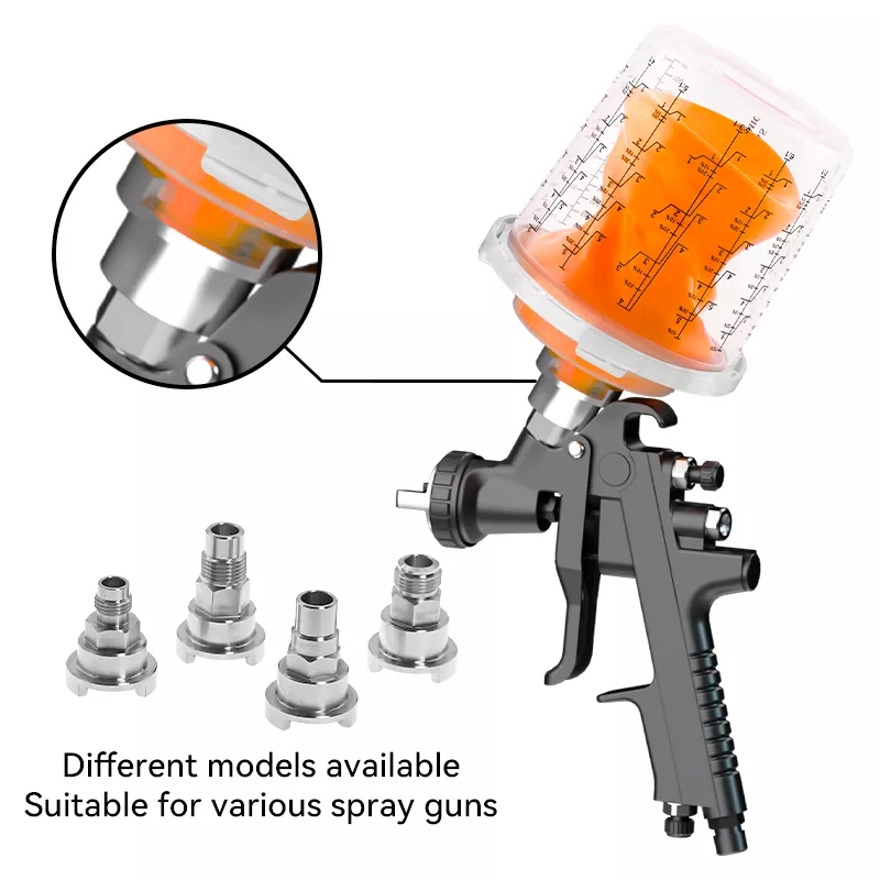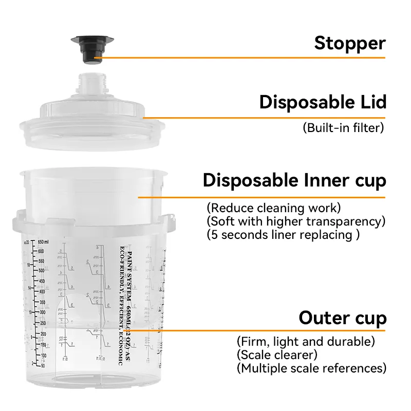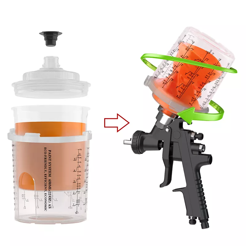 Den transparenta cupdesignen gör det enkelt att observera den återstående färgen. Den engångsspray koppen säkerställer att spraypistolen kan spraya 360 grader utan att läcka färg, vilket kan pevent -ytförorening av träkornet orsakat av färgdropp. Det är lämpligt för PU/NC -färgsprutning på trädörrar, skåp och massiva trämöbler.