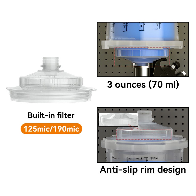 -A AYS3.1 Spray Cup-locket har en dubbelskiktskonstruktion som innehåller upp till 3 gram färg under filtret. Locket förbättrar färgflödet och konsistensen och minskar splatter från början till slut.