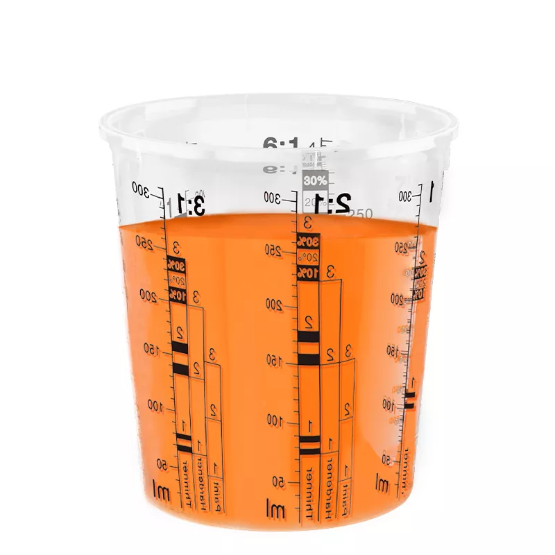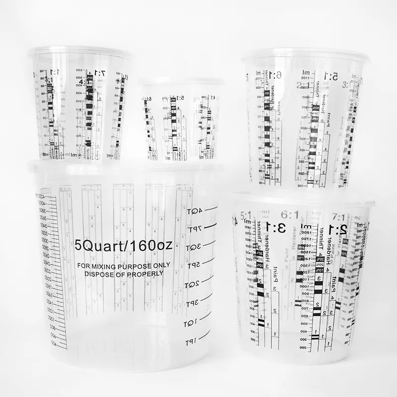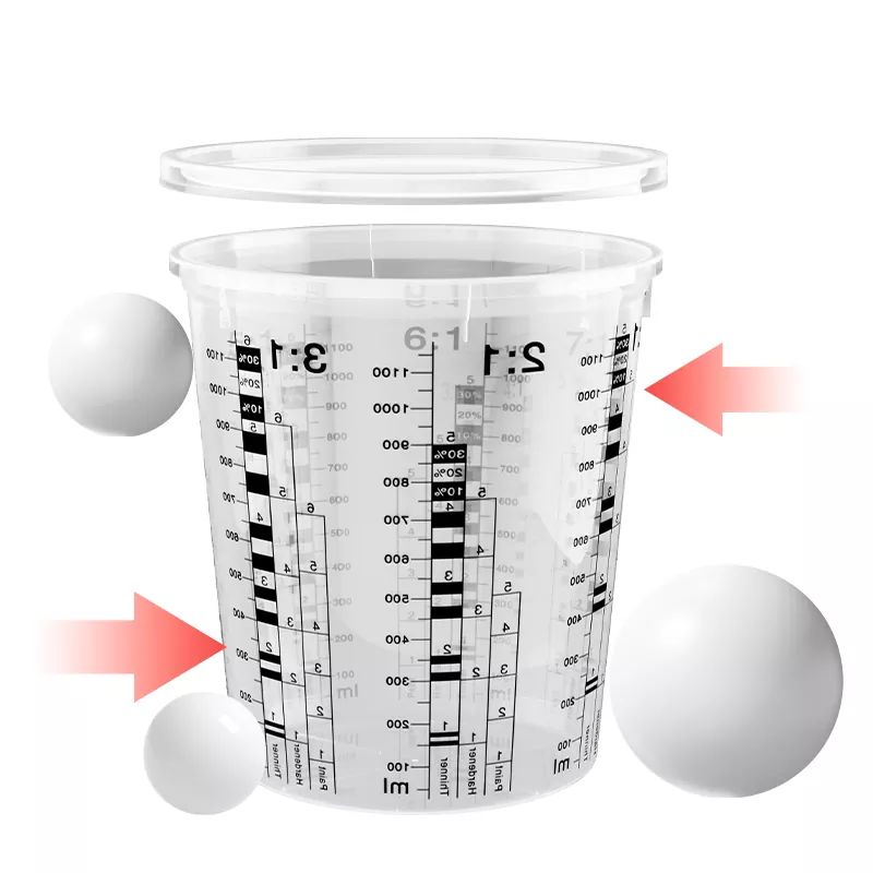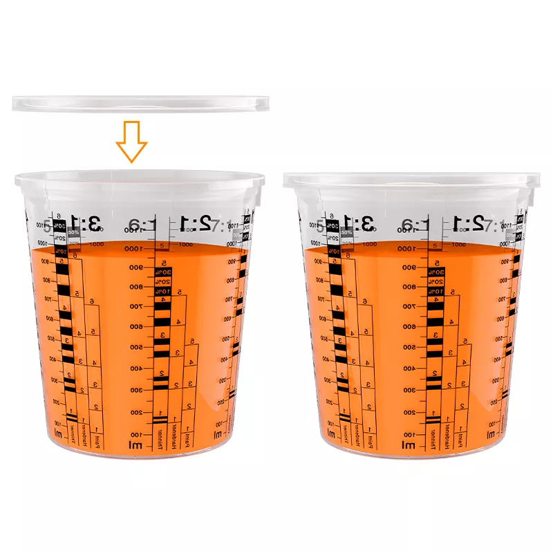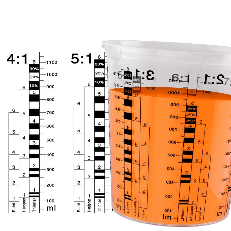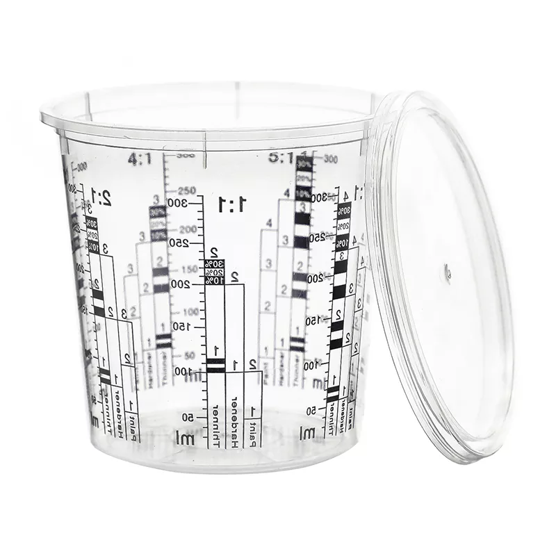 385 ml PP Automotive Paint Mixing Cup med lock för färgblandning och tillfällig förvaring av blandad färg. 7 olika blandningsförhållanden, tydligt tryckta och läsbara från insidan. Mixningskopp med hög kvalitet med lock med lock, lock kan köpas separat. Vi erbjuder fem kapaciteter - 385cc, 680cc, 1370cc, 2250cc och 5000cc - för att passa alla behov.