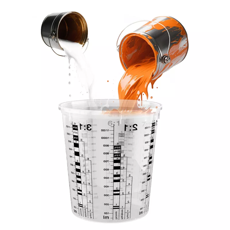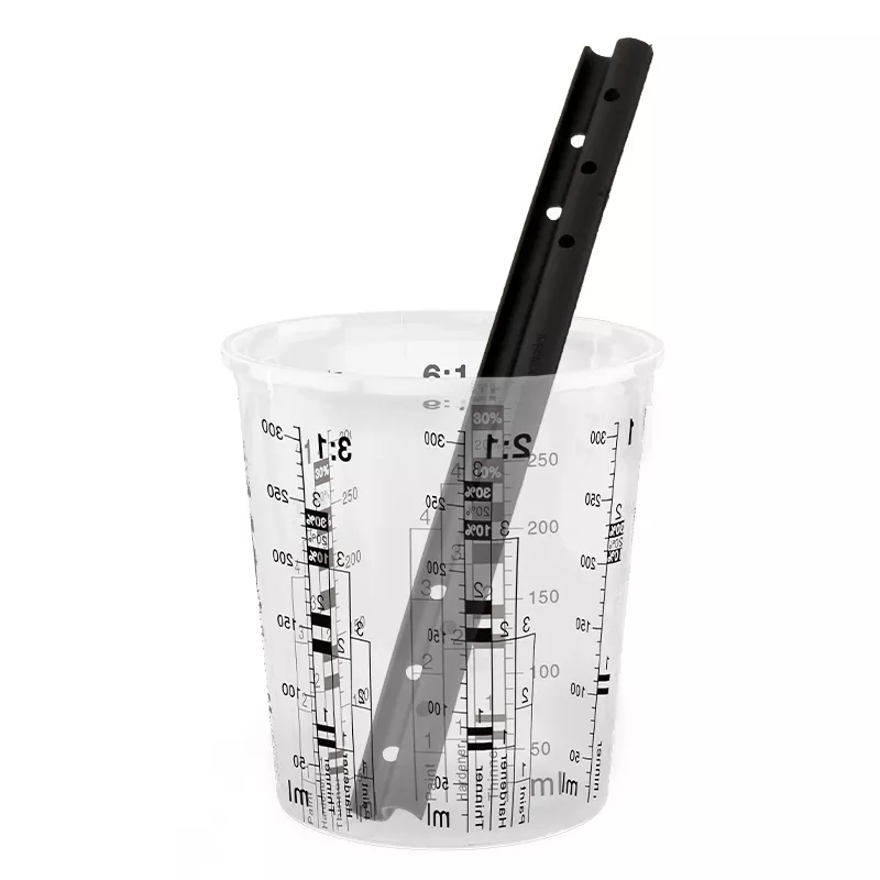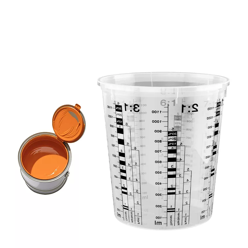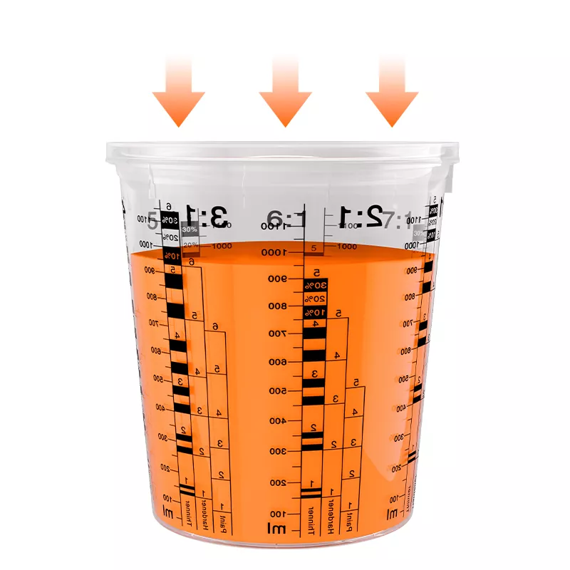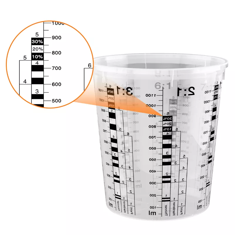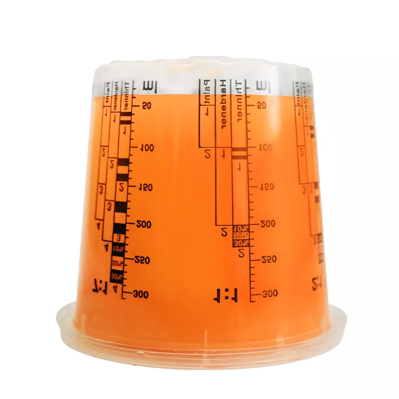 385 ml PP Automotive Paint Mixing Cup med lock för färgblandning och tillfällig förvaring av blandad färg. 7 olika blandningsförhållanden, tydligt tryckta och läsbara från insidan. Mixningskopp med hög kvalitet med lock med lock, lock kan köpas separat. Vi erbjuder fem kapaciteter - 385cc, 680cc, 1370cc, 2250cc och 5000cc - för att passa alla behov.