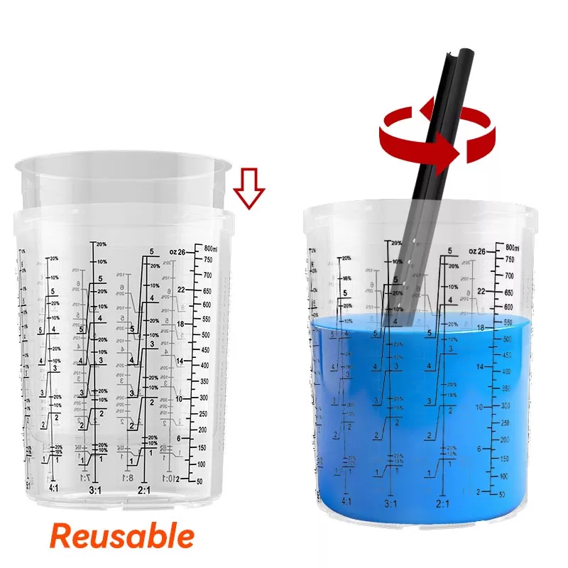 Återanvändbar yttre kopp med blandningsförhållande skala. Sätt in engångsfodret i den yttre koppen och blanda färgen direkt i fodret. Reducera materialkostnad genom att inte använda en traditionell blandningskopp.