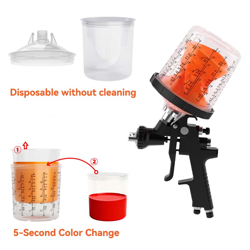 Deengångssprutpistolkopp kräver ingen rengöring efter användning; kassera helt enkelt innerkoppen för att snabbt byta färg, minska färgbytesintervallet från 20 minuter till 5 sekunder, vilket effektivt fördubblar den dagliga produktionen. Locket har ett inbyggt fint filter för att effektivt filtrera föroreningar, vilket säkerställer en enhetlig och jämn spray, vilket resulterar i en finish av högre kvalitet.